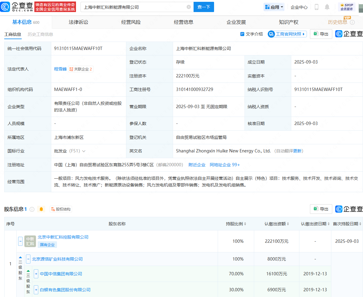 近日小熊猫配资,上海中新汇科新能源有限公司成立,法定代表人为程雪峰,注册资本约为22亿元,经营范围包含:风力发电技术服务;新能源原动设备销售;风力发电机组及零部件销售;发电机及发电机组销售等。企查查股权穿透显示,该公司由中国中信集团有限公司、白银有色(601212)间接共同持股。